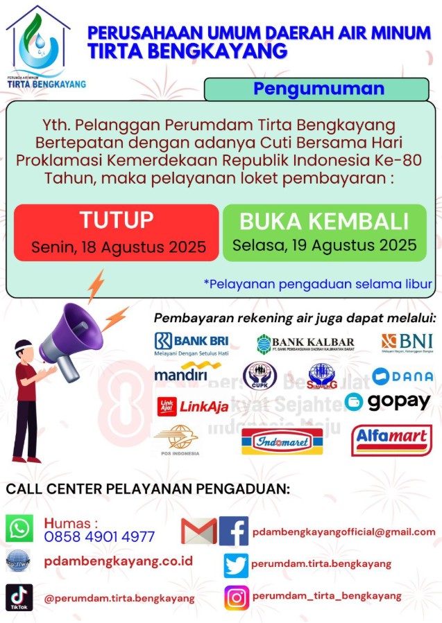 Kantor Perumdam Tirta Bengkayang tutup sementara dalam rangka libur cuti bersama Agustus pada tanggal 18 Agustus 2025. Pelayanan administrasi dibuka kembali tanggal19 Agustus 2025.